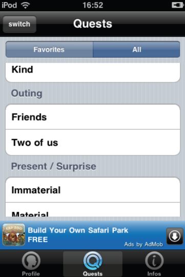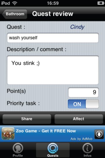 Le principe est simple, lorsque vous éffectuez des tâches ménagères ou bien une corvée que l’on vous a attribué, CoupleQuest vous crédite de points. Ces points seront additionnés et pourront servir pour monnayer des faveurs ou d’autres tâches avec les autres joueurs.