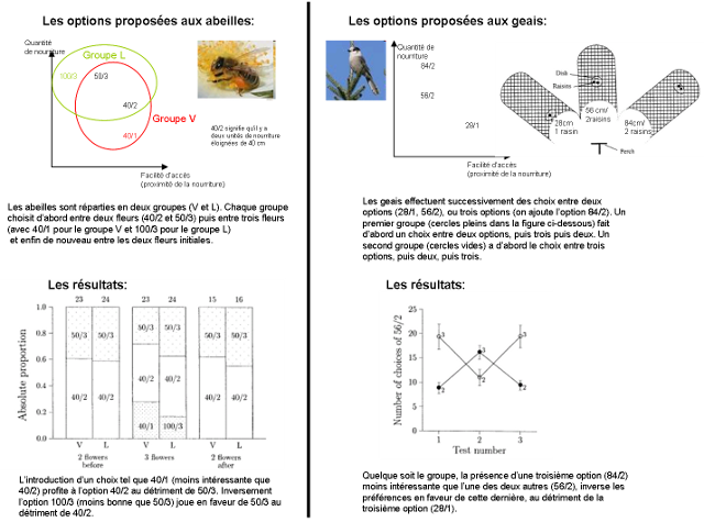 Mais bon, dans bien des cas, nos amis les bêtes sont tout aussi irrationnelles que nous. Rien de tel qu’un petit tour au rayon céréales ou yaourts d’un hypermarché, là où l’on peut rester hagard devant tant de choix. Vous hésitez entre les Bio-super-top (A) à 6€ et les Low-sugar-double-plus (B) à 3€ seulement? Si à ce moment là on vous présente des Bio-beurk (A’) à 8€ (donc plus chers et moins bons que A) normalement ça ne devrait rien changer à votre (in)décision. Et pourtant il y a toutes les chances qu’un tel repoussoir vous incite à choisir des Bio-super-top (A), du seul fait qu’ils supportent mieux la comparaison avec les Bio-Beurks. Ce phénomène de “faire-valoir” semble universel chez les humains et de nombreuses expériences ont été montées pour savoir si les animaux y étaient sujets. On a par exemple mesuré chez des abeilles et chez des geais leurs préférences entre deux dispositifs :