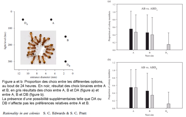 Pour tester cette hypothèse, des chercheurs sont allés chercher un truc vivant dont les prises de décisions ne dépendraient pas d’un système nerveux classique. Ils ont réussi à faire passer le test de “faire-valoir” à des colonies de fourmis. On sait que les fourmis préfèrent les nids protégés de la lumière et dont l’entrée est petite (donc plus facile à garder). Ils les ont donc forcées à choisir entre un nid à petite entrée mais exposé à la lumière (A) ou bien un nid obscur mais avec une entrée large (B). Puis ils ont observé l’effet d’un troisième choix servant de faire-valoir soit à A (DA) soit à B (DB). Et là miracle…