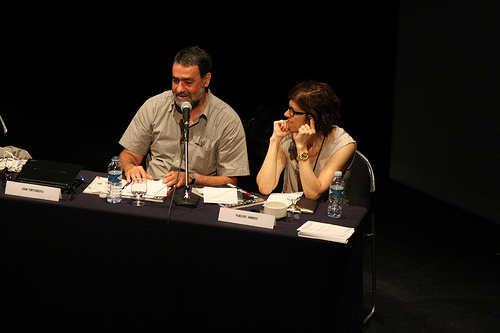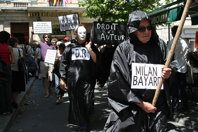 La photo numérique enfin reconnue et valorisée par le principal festival de photographie, les Rencontres d’Arles? Pas si vite. La prise de position hier de Juan Fontcuberta, artiste reconnu et principal instigateur de l’exposition “From here on”, célébrant la «joie» de la «révolution numérique» dans le cadre du très officiel colloque des Rencontres, a été accueillie fraîchement par le public. Quelques heures plus tard s’ébranlait la manifestation de l’UPP en faveur du droit d’auteur, marche funèbre à travers les rues de la ville sous les pancartes “Fotolia m’a tuer” ou “Les images libres de droits entraînent une mort lente et douloureuse des photographes” (voir ci-dessous). L’exposition amirale de la 42e édition suscite des commentaires interrogatifs ou sarcastiques. Au pays des cigales et de Lucien Clergue, rien n’a encore vraiment changé.