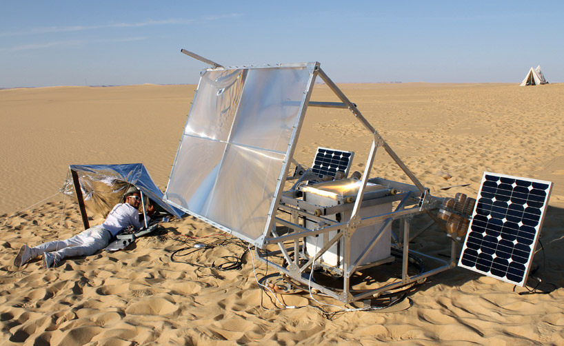 the machine utilizes the abundant desert resources of sun and sand to drive an automatic, computer-controlled 3D printer capable of producing glass objects.